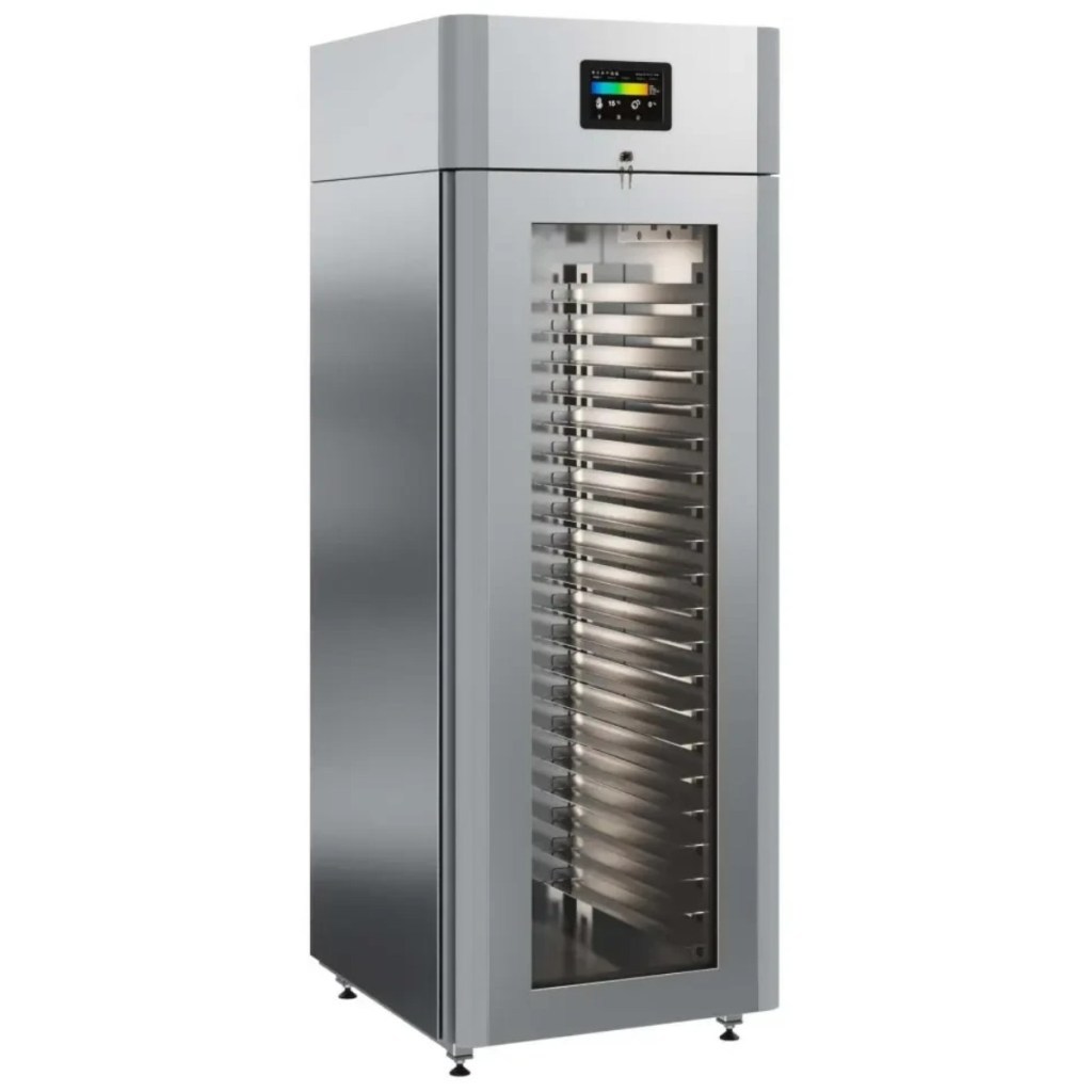 Каталог оборудования Холодильное оборудованиеШкафы холодильныеСпециализированные холодильные шкафыШкаф холодильный для хлебопекарных производств Polair CS107-Bakery Br со стеклом (Тип 1) Шкаф холодильный для хлебопекарных производств Polair CS107-Bakery Br со стеклом (Тип 1) Код товара: 062-622 Поделиться: WhatsAppTelegram СравнитьДобавить в КПВ избранное 0 414 545 ₽ В корзину 0 шт Под заказСамовывоз сегодня бесплатно Взять в кредит Купить в лизинг Получить консультацию в WhatsApp Описание Характеристики Отзывы 0 Инструкции 5 Шкаф холодильный для хлебопекарных производств Polair CS107-Bakery Br со стеклом (Тип 1) предназначен для создания оптимальных условий хранения и расстойки заготовок из теста на предприятиях общественного питания и торговли. Цельнозаливной корпус выполнен из нержавеющей стали, дверь — стеклопакет. Оборудование стабильно работает при температуре окружающей среды до +40 °C. В комплект входят 20 пар направляющих размером 400×600 мм. Особенности: Широкий функционал: охлаждение, замедление ферментации, хранение, регенерация, брожение и расстойка Динамическое охлаждение с мягким обдувом без заветривания и автоматическая оттайка с системой испарения конденсата Панель управления с 5" дисплеем: контроль температуры, влажности (регулируется от 60 до 95 %), скорости вентилятора и времени, а также возможность создания и сохранения программ Встроенный ультразвуковой увлажнитель (необходима система водоочистки и канализация) Эргономичная конструкция: верхнее расположение агрегата, распашная дверь со стеклопакетом, механизм самозакрывания, педаль для открытия, съёмные направляющие и легко заменяемый уплотнитель с магнитной вставкой Дополнительная защита: пластиковый бордюр по периметру камеры для предотвращения повреждений от тележек Простота ухода: штампованное углубление в дне корпуса для сбора загрязнений Экологичный хладагент R290 и энергоэффективность: потребляемая мощность — 0,55 кВт (охлаждение), 0,9 кВт (нагрев) Толщина стенки корпуса — 43 мм Polair CS107-Bakery Br со стеклом (Тип 1) — надёжный и многофункциональный шкаф, который обеспечивает полное управление процессами брожения и расстойки теста. Современная система охлаждения и увлажнения, продуманная конструкция и удобное управление делают его оптимальным решением для пекарен и кондитерских, стремящихся к стабильному качеству и высокой производительности.Изображение товара, представленного на фото, может отличаться от его фактического вида. Показать все Габаритные размеры697×1005×1960 ммДиапазон рабочей температурыот -10 до +40 °CДлина697 ммШирина1005 ммВысота1960 ммОбъём700 лКол-во дверей1 Тип двериСтеклянная Уровень влажностиот 60 до 95 %Направляющие под EN 40*6020 Расстояние между направляющими60 ммХолодильный агрегатВстроенный Тип оттайкиАвтоматическая Тип охлажденияДинамический ПодсветкаЕсть ХладагентR290 Вес нетто180 кгБрендPolairВсе специализированные холодильные шкафы Из нержавейки Оставить отзыв Еще никто не оставил отзыв на этот товар Схема POLAIR CS107 Bakery Br.jpgИнструкция на POLAIR CS107 Bakery Br.pdfБрошюра на хлебопекарное оборудование POLAIR.pdfДекларация о соответствии.pdfСертификат соответствия.pdf Похожие товары Перейти в каталог Под заказ 397 800 ₽ Шкаф холодильный для вызревания сыра Polair CS107 Cheese полки нерж., со стеклом Под заказ 385 475 ₽ Шкаф холодильный для вызревания сыра Polair CS107 Cheese полки окраш. Под заказ 282 471 ₽ Шкаф холодил