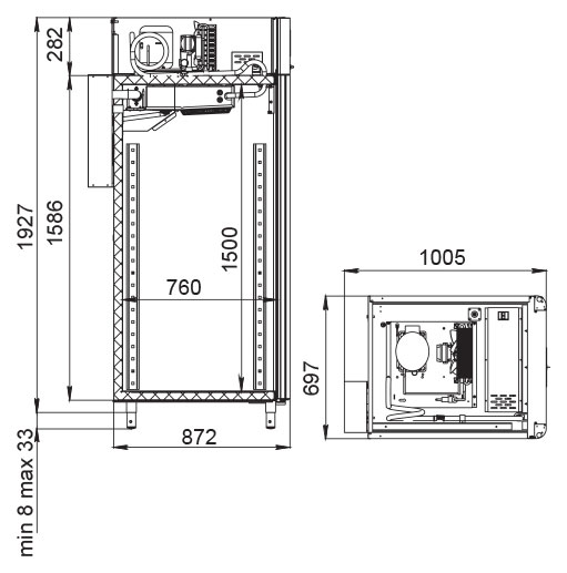 Каталог оборудования Холодильное оборудованиеШкафы холодильныеСпециализированные холодильные шкафыШкаф холодильный для вызревания салями Polair CS107 Salami черный, со стеклом Шкаф холодильный для вызревания салями Polair CS107 Salami черный, со стеклом Код товара: 062-632 Поделиться: WhatsAppTelegram СравнитьДобавить в КПВ избранное 0 373 915 ₽ В корзину 0 шт Под заказСамовывоз сегодня бесплатно Взять в кредит Купить в лизинг Получить консультацию в WhatsApp Описание Характеристики Отзывы 0 Инструкции 5 Шкаф холодильный для вызревания салями Polair CS107 Salami черный, со стеклом предназначен для приготовления и хранения салями, сыровяленых колбас и других мясных деликатесов на предприятиях общественного питания и торговли. Цельнозаливной монолитный корпус выполнен из нержавеющей стали снаружи и внутри (кроме задней стенки), что обеспечивает высокую прочность, долговечность и удобство ухода. Оборудование рассчитано на работу при температуре окружающей среды до +40 °С. Особенности: Динамическое охлаждение с мягким обдувом без заветривания Верхнее расположение агрегата Автоматическая оттайка с системой испарения конденсата Русифицированная многофункциональная панель управления с дисплеем диагональю 5" Возможность создания и сохранения индивидуальных программ Встроенный ультразвуковой увлажнитель (необходима подача очищенной воды и подключение к канализации) UV-лампа для обеззараживания воздуха внутри камеры Три уровня подвесов с тремя перекладинами и крюками на каждом уровне для удобной развески колбас Регулируемый уровень влажности: от 60 до 95 % Распашная дверь с заливной теплоизоляцией, встроенной ручкой и магнитным уплотнителем Отключаемая LED-подсветка камеры Штампованное углубление в дне корпуса для удобства ухода Педаль для удобного открытия двери Хладагент R290 (пропан) Толщина стенки корпуса: 43 мм Polair CS107 Salami черный, со стеклом — это профессиональный холодильный шкаф, идеально подходящий для цехов, гастробаров и мясных мастерских. Он обеспечивает оптимальные условия для дозревания и хранения деликатесов за счёт точного контроля температуры и влажности, продуманной конструкции и расширенного функционала. Такой шкаф помогает сохранять качество и вкус продукции на высоком уровне.Изображение товара, представленного на фото, может отличаться от его фактического вида. Показать все Габаритные размеры697×1005×1960 ммДиапазон рабочей температурыот -2 до +30 °CДлина697 ммШирина1005 ммВысота1960 ммОбъём700 лКол-во дверей1 Тип двериСтеклянная Уровень влажностиот 60 до 95 %Холодильный агрегатВстроенный Тип оттайкиАвтоматическая Тип охлажденияДинамическое ПодсветкаЕсть UV-лампаЕсть ХладагентR290 Вес нетто160 кгВес брутто190 кгБрендPolairВсе специализированные холодильные шкафы Из нержавейкиВсе специализированные холодильные шкафы Стеклянная дверь Оставить отзыв Еще никто не оставил отзыв на этот товар Схема POLAIR CS107 Salami.jpgИнструкция на POLAIR CS107 Salami.pdfБрошюра на POLAIR CS107 Salami.pdfДекларация о соответствии.pdfСертификат соответствия.pdf Похожие товары Перейти в каталог Под заказ 118 831 ₽ Шкаф холодильный HURAKAN HKN-MA100 для созревания мяса Под заказ 252 314 ₽ Шкаф холодильный для вызревания мяса и сыра Carboma M700GN-1-G-MHC 9005 Под заказ 399 500 ₽ Шкаф холодильный для вызревания мяса Polair CS107 Meat со стеклом (Тип 1) Под заказ 389 300 ₽ Шкаф холодильный для вызревания сыра Polair CS107 Cheese черный, со стеклом Под з
