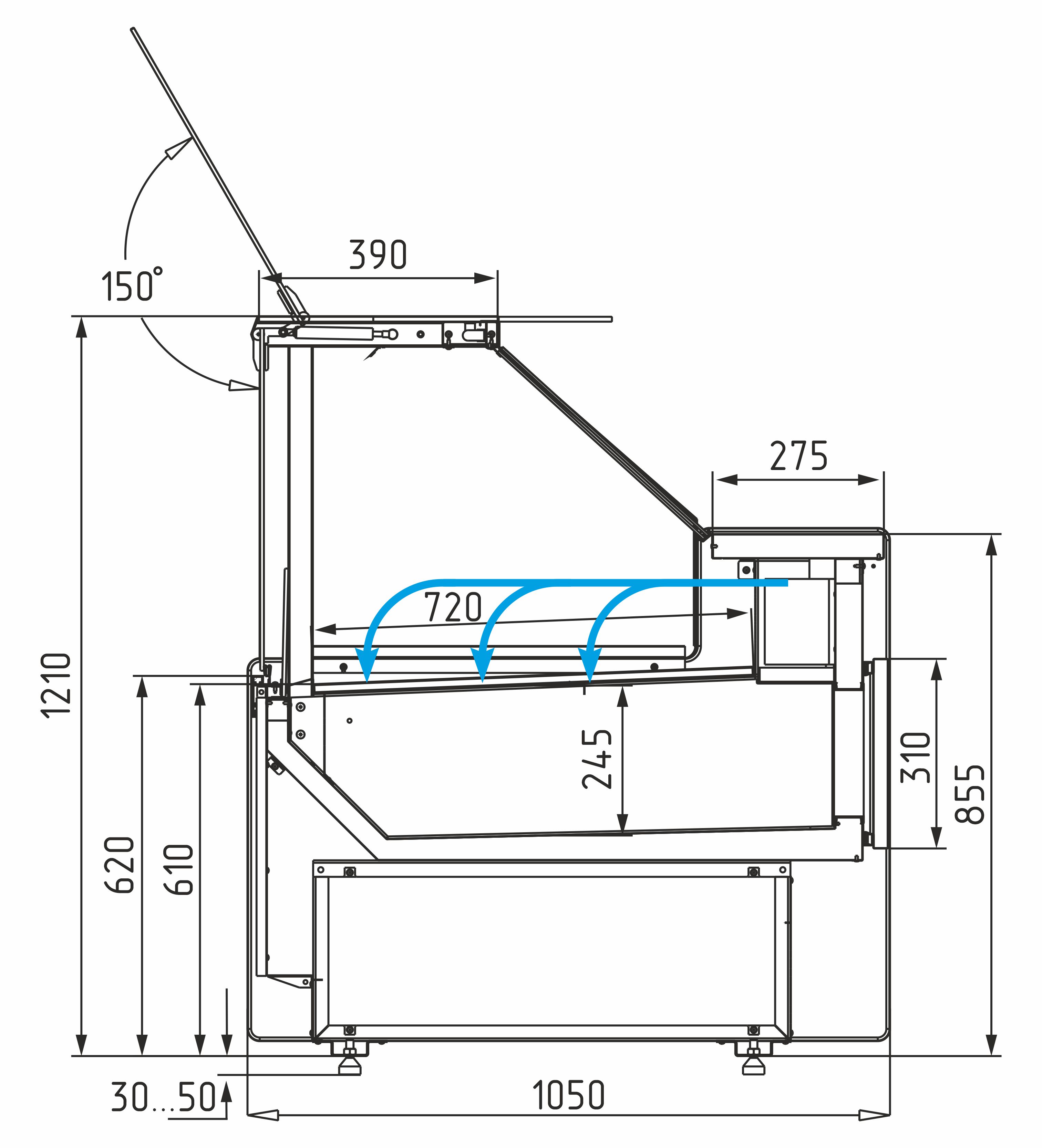 • Подъёмное фронтальное стекло с газлифтом — удобный доступ к продуктам и лёгкое обслуживание.